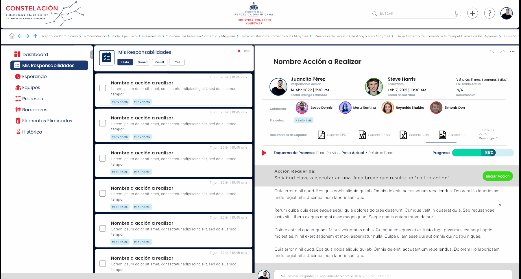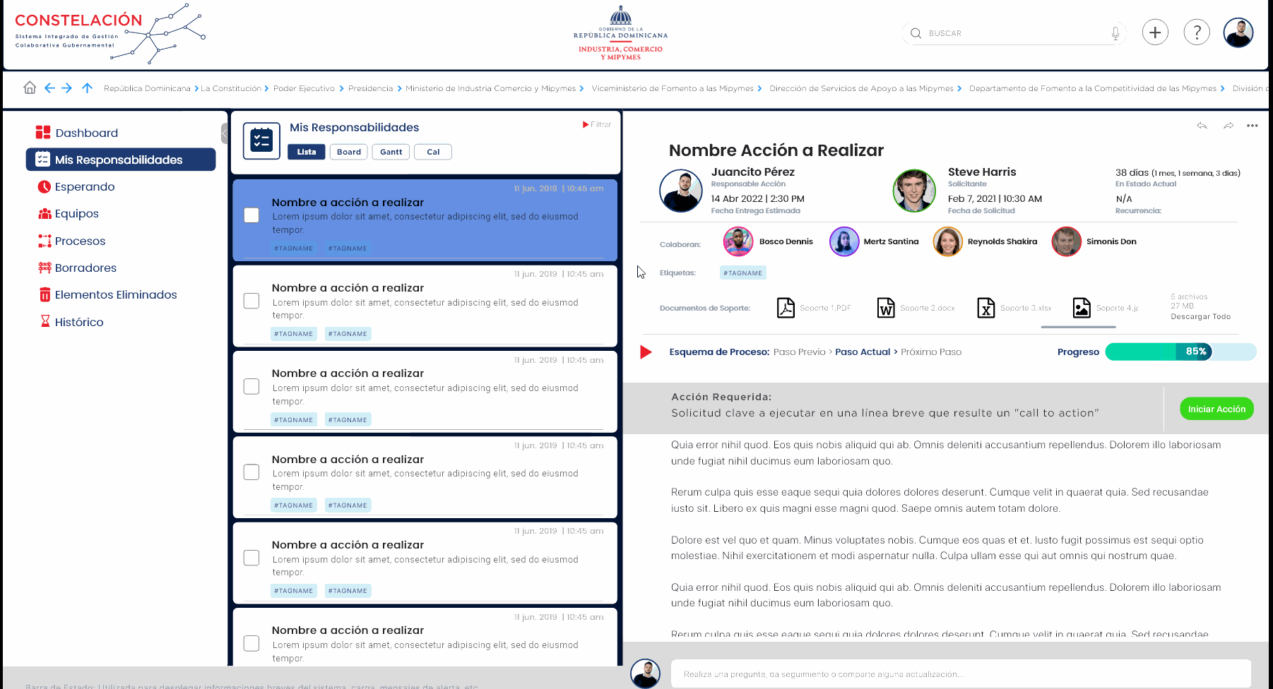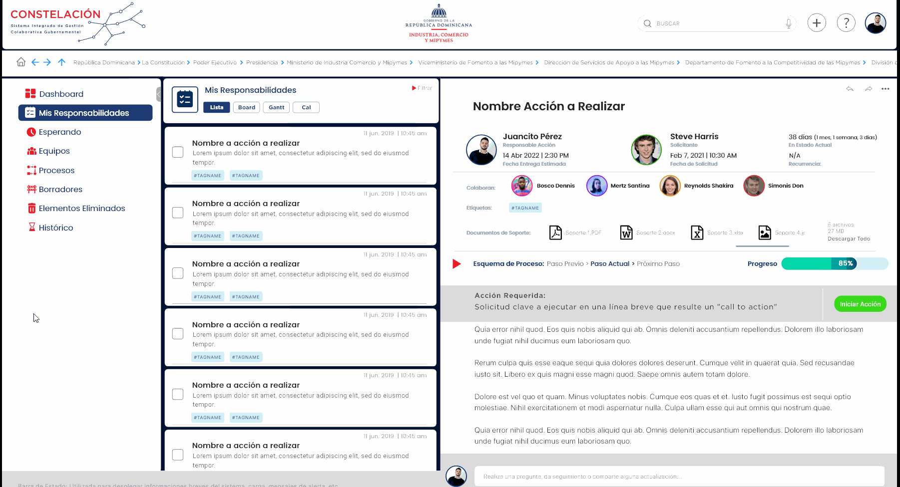 El espacio principal de accionar de los colaboradores donde pueden ver sus responsabilidades activas agrupadas según las funciones asignadas a su cargo. Permite brindar en una interfaz familiar, innovaciones en cuanto a claridad de accionar, responsabilidades del colaborador y estatus de procesos.