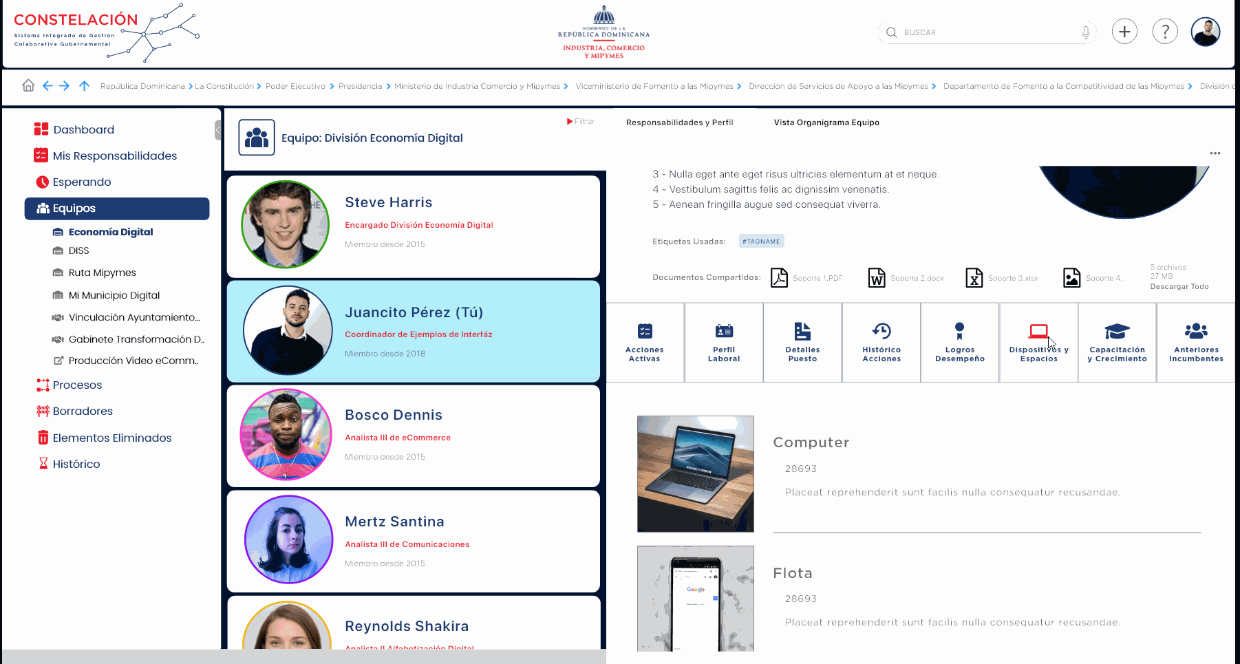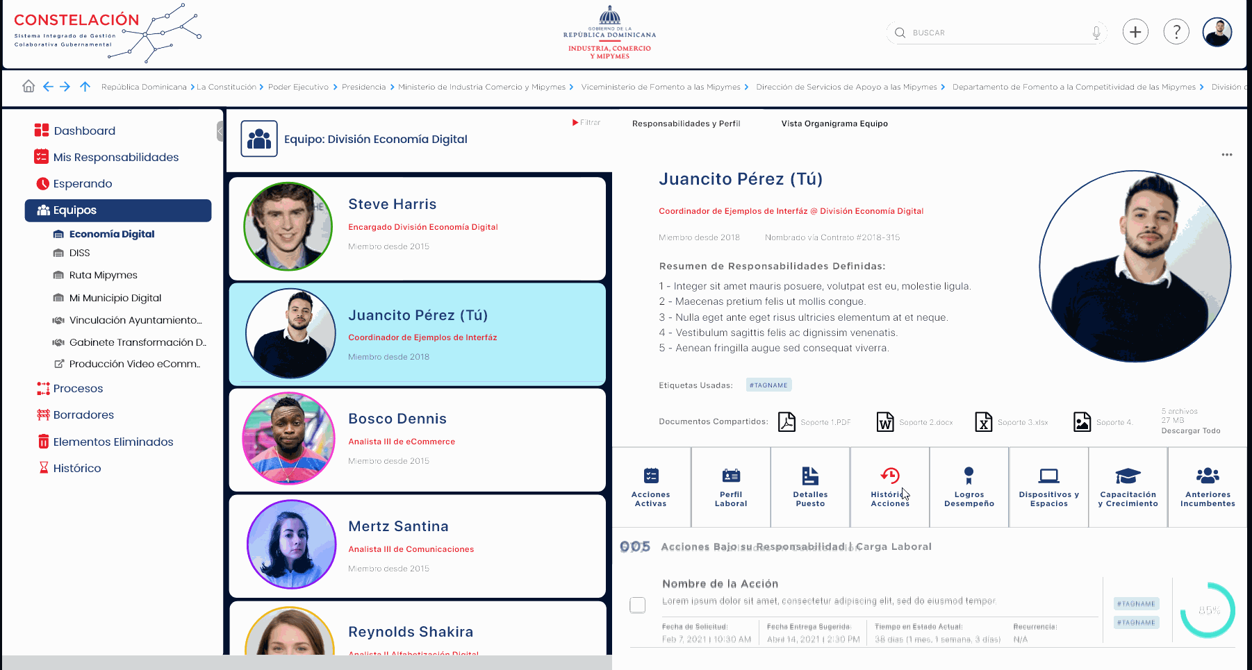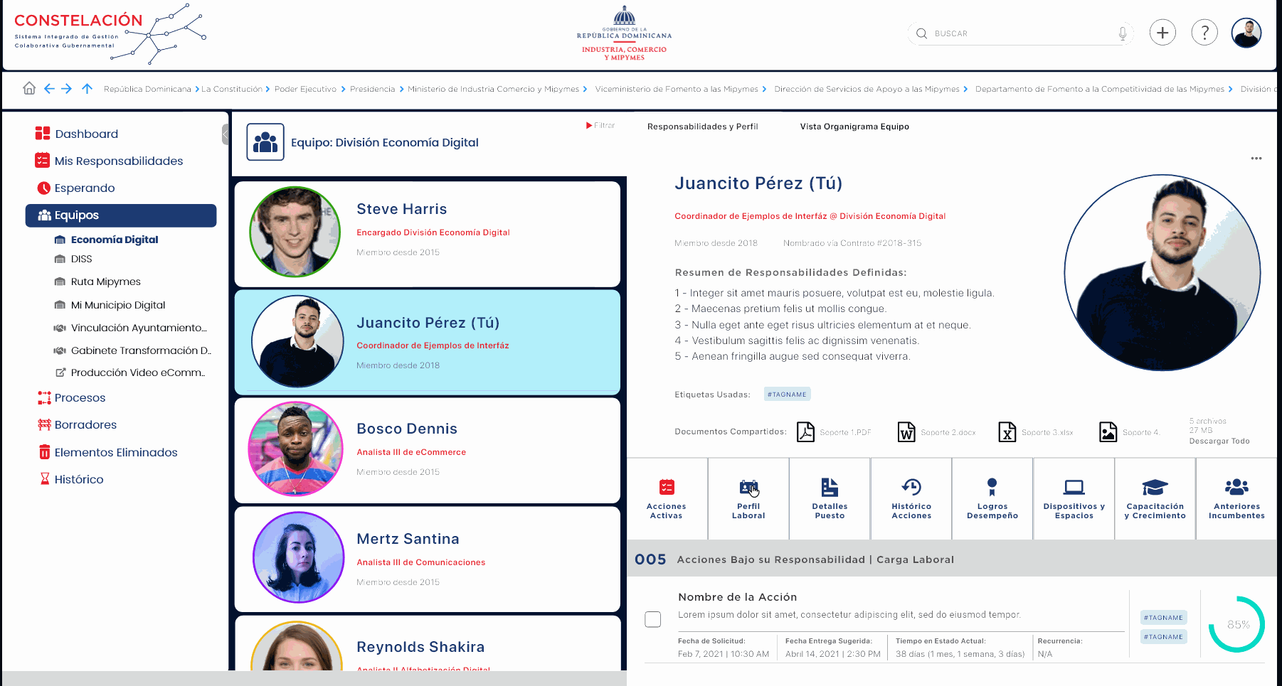 El espacio principal de accionar de los colaboradores donde pueden ver sus responsabilidades activas agrupadas según las funciones asignadas a su cargo. Permite brindar en una interfaz familiar, innovaciones en cuanto a claridad de accionar, responsabilidades del colaborador y estatus de procesos.